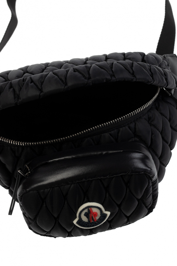 Black ‘Felicie’ quilted belt bag from Moncler. Emblazoned with a cream logo patch on the front, this design features a zip fastening, a frontal pocket, an adjustable strap with a metal buckle and one internal compartment.