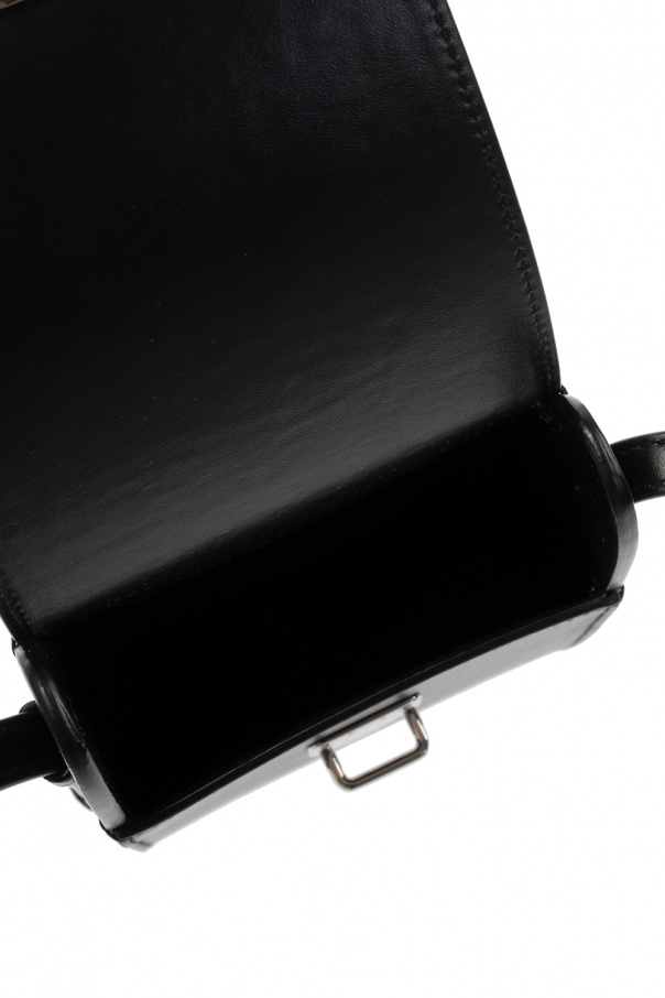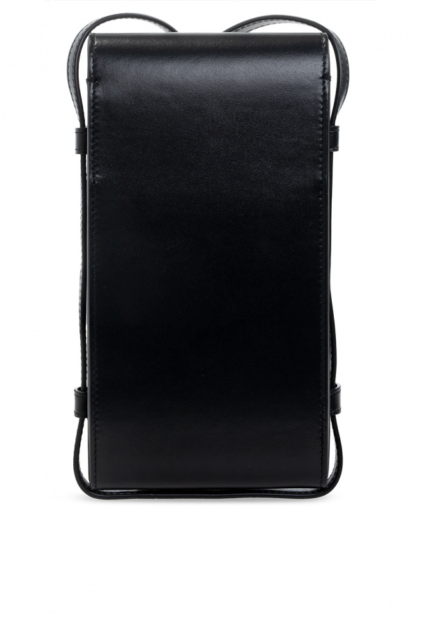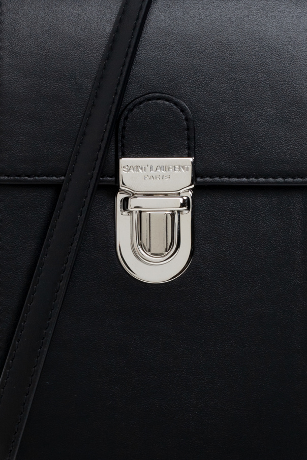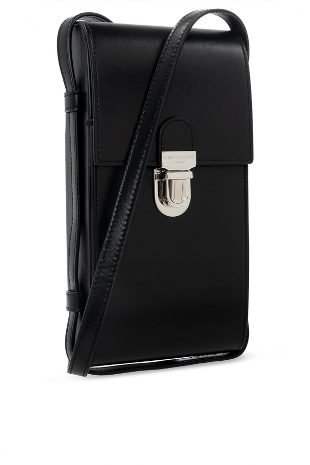 Black ‘Tuc’ iPhone case from Saint Laurent. Crafted from calf leather, this item fastens via a snap and showcases an embossed logo on the front, a detachable and adjustable shoulder strap, silver-tone metal hardware and a black suede-clad interior with one compartment.