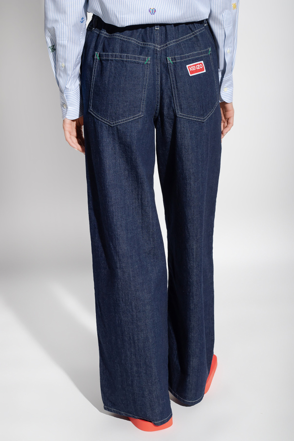 Navy jeans from Kenzo. This pair features an elastic drawstring waistband, logo patch at the back, two front pockets, two back pockets and wide legs.