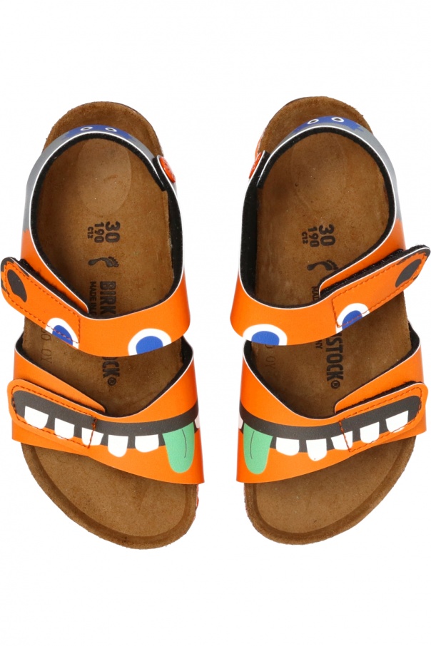 Orange and grey ‘Palu’ sandals from Birkenstock Kids. Fastened with velcro, this design features a printed pattern and rubber sole in brown and orange.