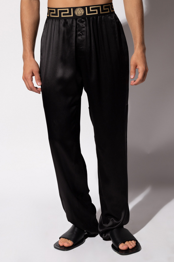 Black pyjama pants from Versace. Made of silk, this pair features an elasticated waistband with an embroidered Greek pattern and a motif of Medusa in gold-tone.