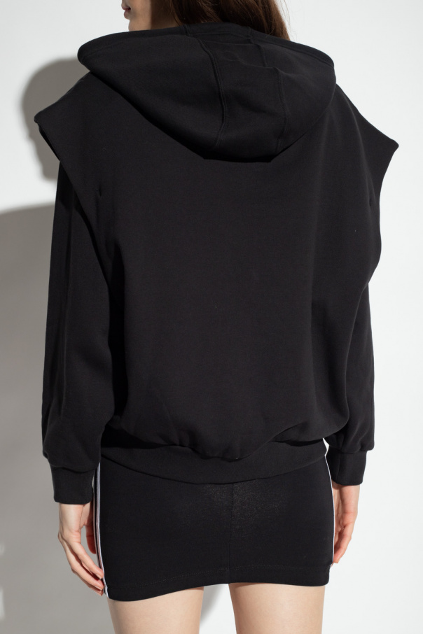 Black two-layered loose-fitting sweatshirt from ADIDAS Originals. Made of cotton. The outer layer is sleeveless and features a round neck, front pocket and white logo print. The detachable cropped lining is complete with a drawstring hood, white logo embroidery, drawstring hem and long sleeves with ribbed cuffs.
