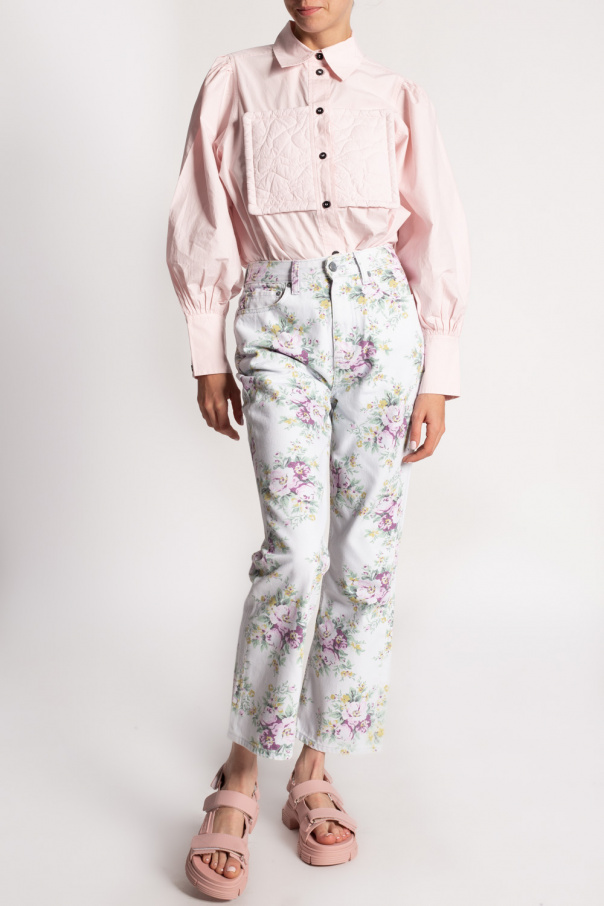 Light blue jeans from Ganni. Fastened with a zip and button, this garment features a multicolored floral pattern, five slip pockets, cream and white logo patch at the back and flared legs.