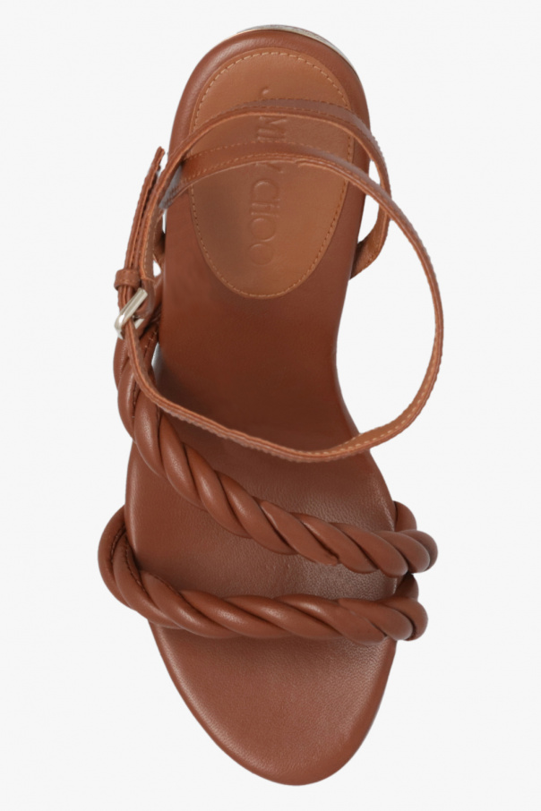 Brown ‘Diosa’ wedge sandals from Jimmy Choo. Crafted from leather, this pair features an adjustable buckled ankle strap, decorative woven straps at the toes, logo-engraved metal appliqué in gold-tone and beige cork sole with rubber trims.