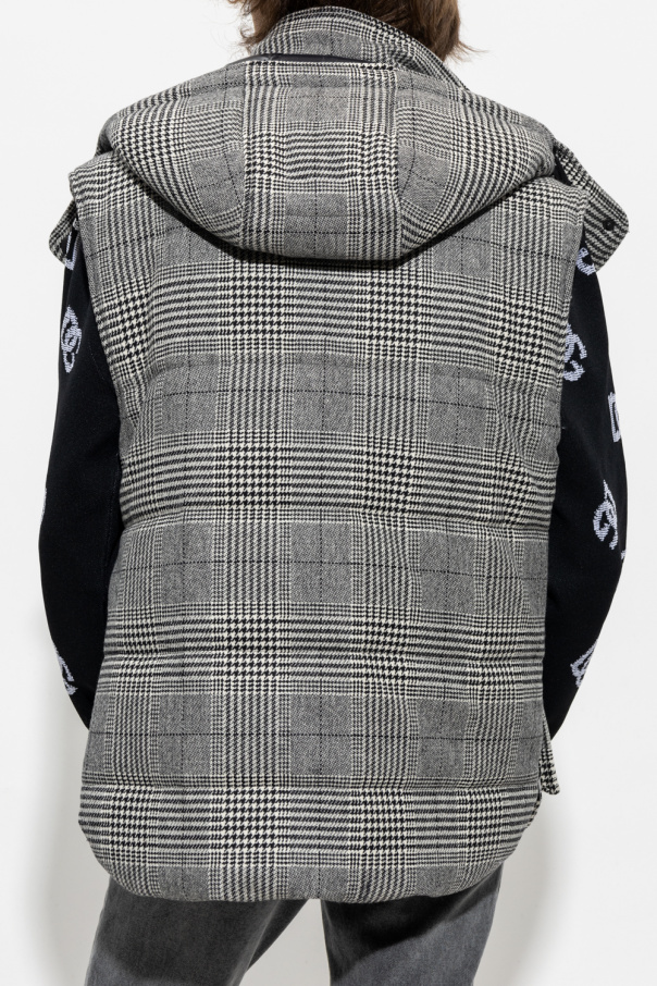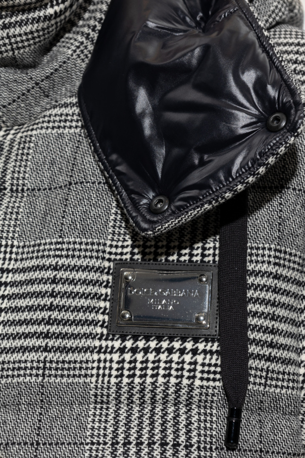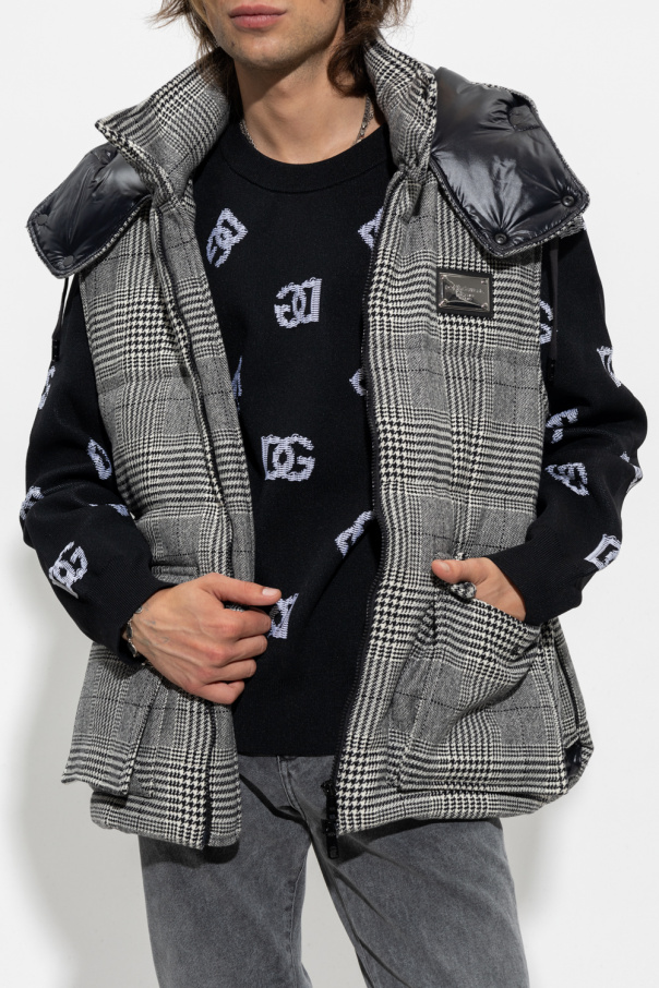 Black and white insulated quilted vest from Dolce & Gabbana. Fastened with a two-way zip, this garment features snap fastenings at the stand collar and hood, houndstooth pattern, metal logo-engraved logo, two slip pockets, two snap-fastened flap pockets and zips on the sides.