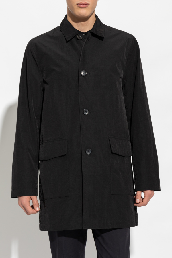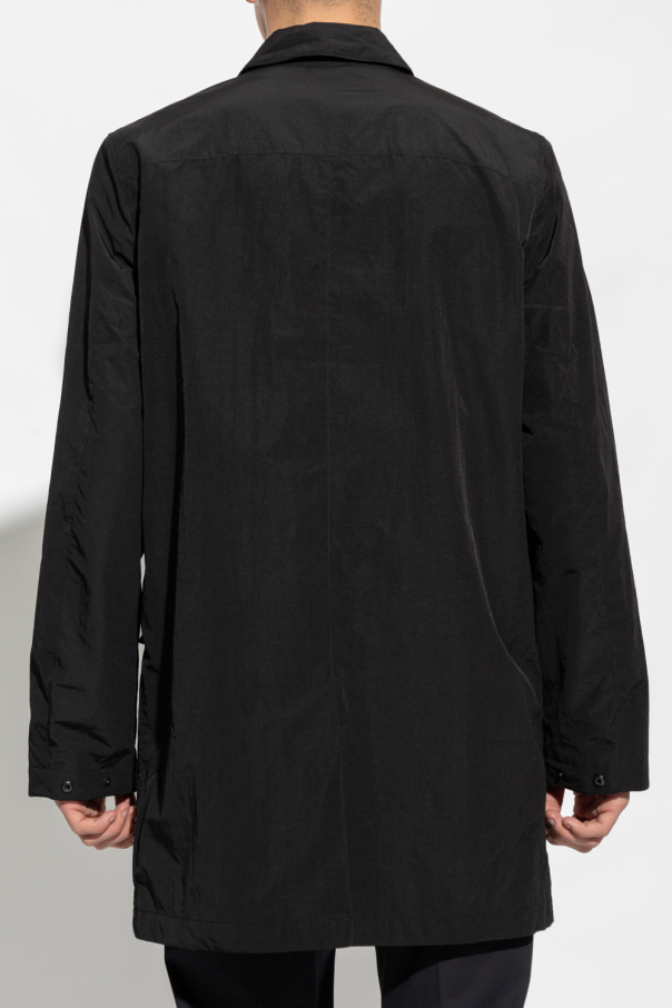 Black coat from PS Paul Smith. Embroidered with the brand's logo, this style features a short fit, button fastenings, two flapped pockets with snaps, long sleeves, a single back vent and a blue and green mesh lining.