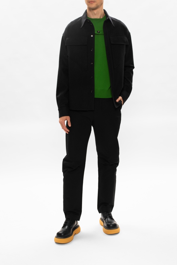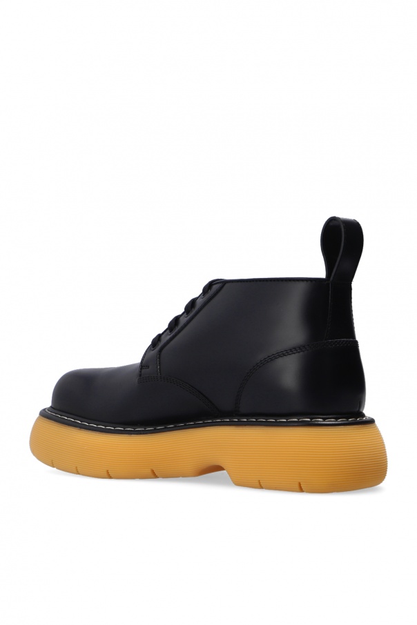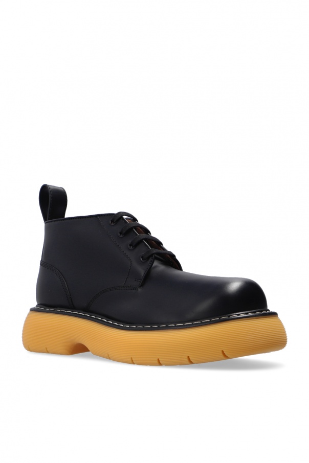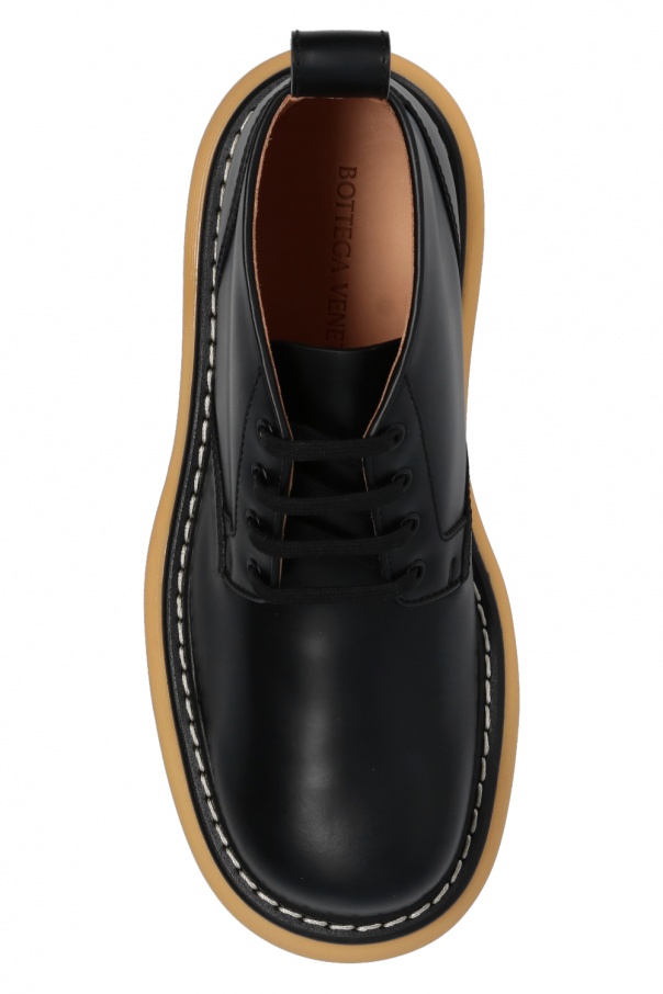 Black and beige ‘The Bounce’ platform shoes from Bottega Veneta. Crafted from calf leather, this model is complete with stitching details and a rubber sole.