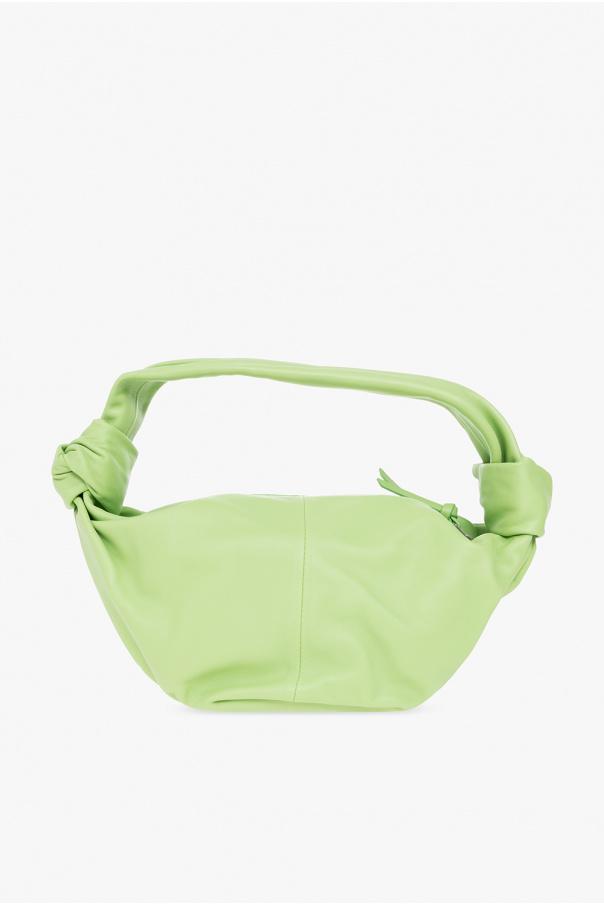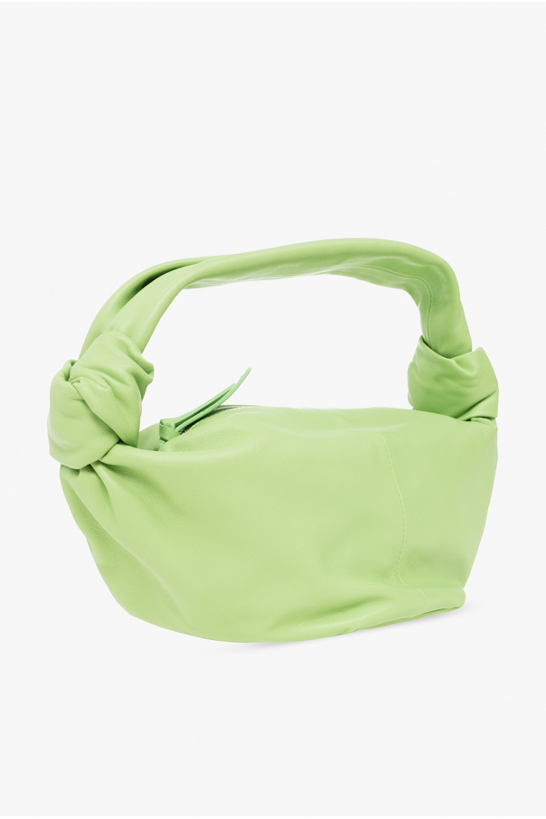 Light green ‘Double Knot Mini’ hobo handbag from Bottega Veneta. Crafted from smooth calf leather, this design features a zip fastening, a short handle accentuated with decorative knots, silver-tone metal hardware and one internal compartment.