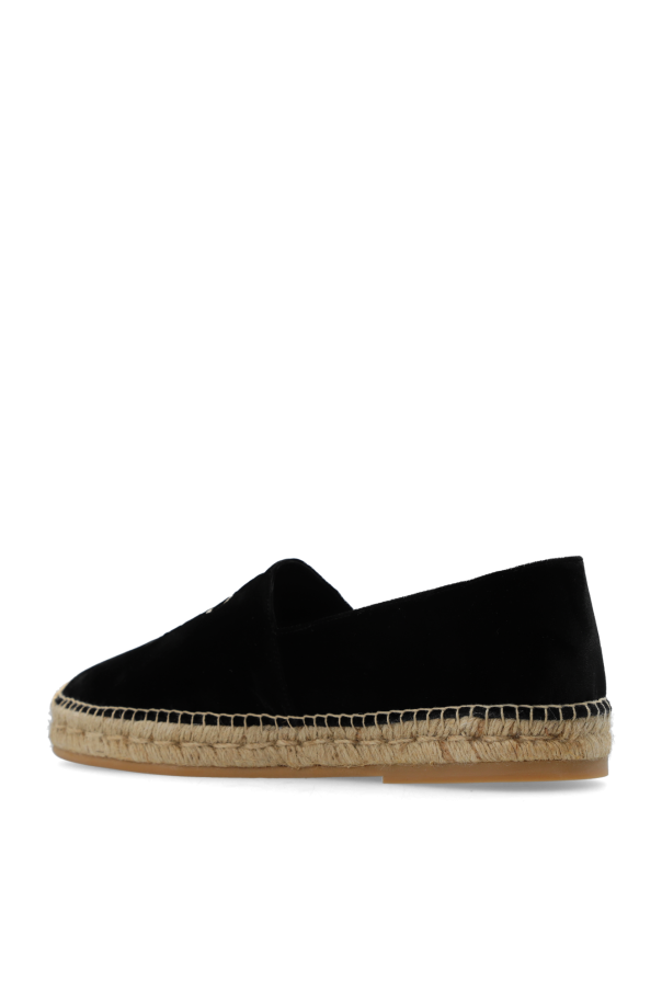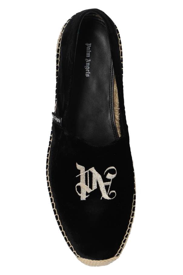Black espadrilles from Palm Angels. Rendered in velvet, this model sits on a beige rubber sole and showcases an embroidered beige logo on the front.