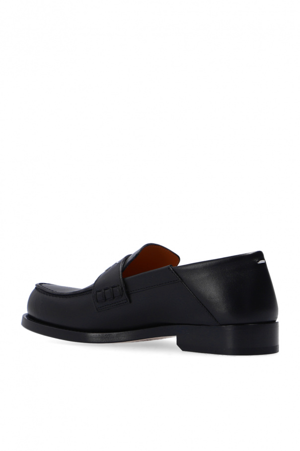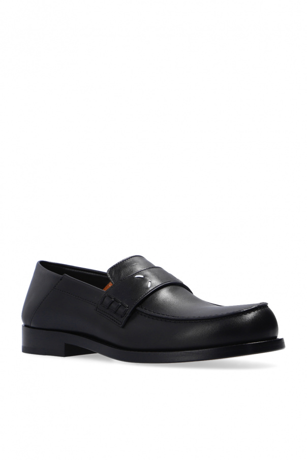 Black moccasins from Maison Margiela. Made of leather, this pair sits on a beige leather sole and showcases an embroidered white logo.