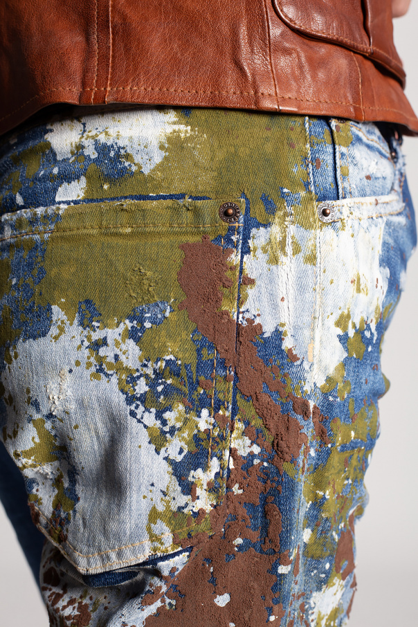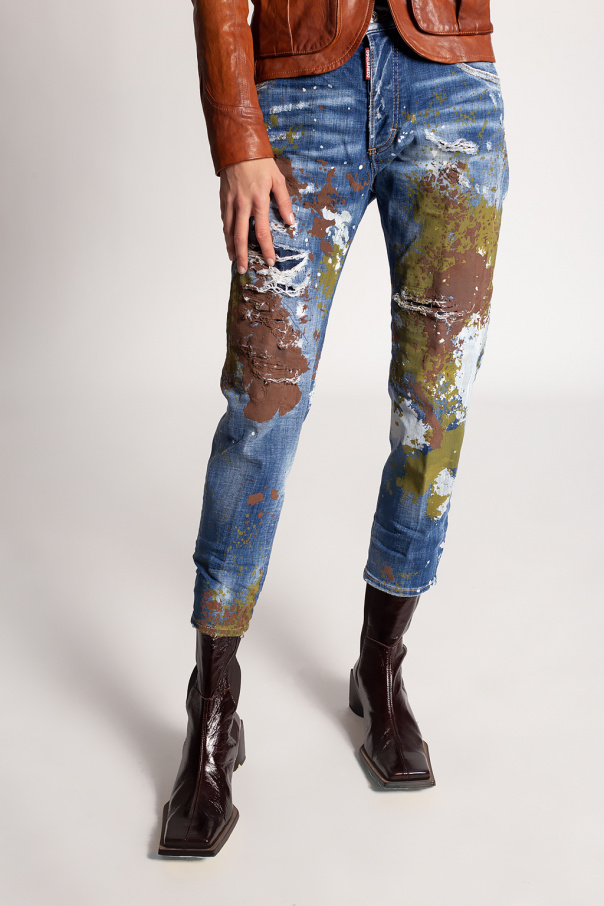 Blue ‘Skinny Dan Cropped Jean’ distressed jeans from Dsquared2. Fastened with buttons, this tapered leg design features a green, brown and white paint splatter effect as well as two front pockets and two back pockets.