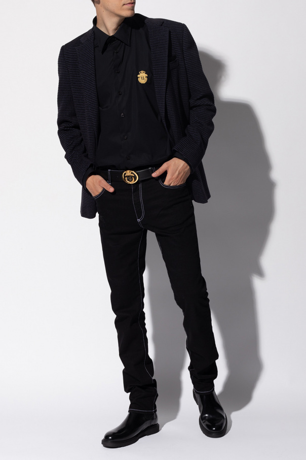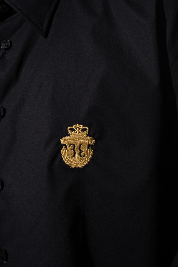 Black shirt from Billionaire. Crafted from cotton, this style showcases the brand's signature crest embroidered in gold-tone on the left chest. Button fastenings, a small leaf collar and long sleeves with button cuffs complete the look.