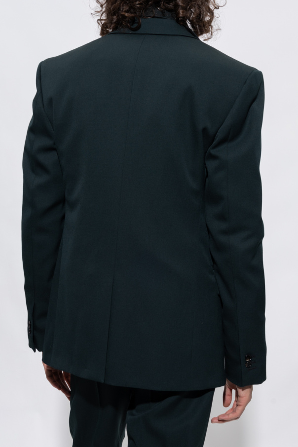 Dark green blazer from Bottega Veneta. Crafted from wool, this style features notch lapels, button fastenings, two flapped pockets, long sleeves and a single back vent.