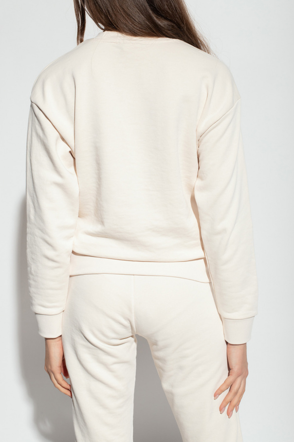 Cream crewneck sweatshirt from Adidas Originals, the ‘Retro Luxury’ collection. Made of a blend of recycled polyester and cotton from sustainable farms, this style showcases the brand's logo rendered in a red print and embroidery on the front and rib-knit trims on the collar, bottom hem and cuffs. The loose-fitting silhouette and a graphic print nod to the item's '70s inspiration.