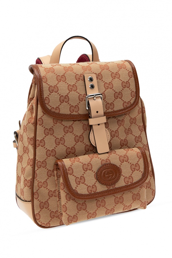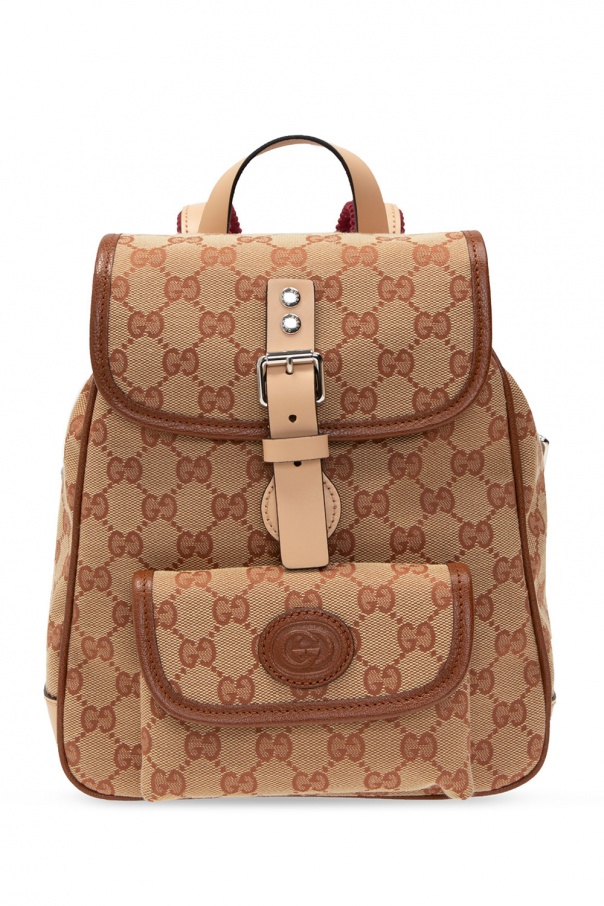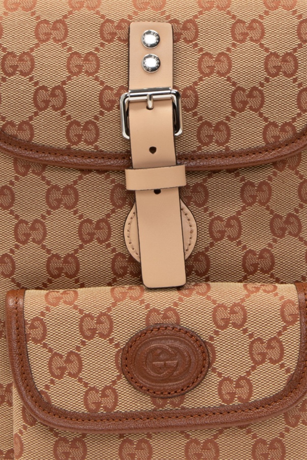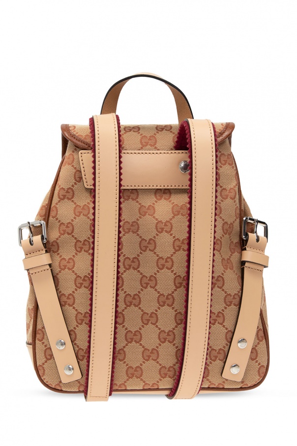 Brown backpack from Gucci Kids. Crafted from ‘GG Supreme’ canvas and finished with textured leather, this design secures with a buckle strap and showcases a branded patch, an external flapped pocket with a magnetic closure on the front, a half-round top handle, adjustable shoulder straps and interior with one compartment.