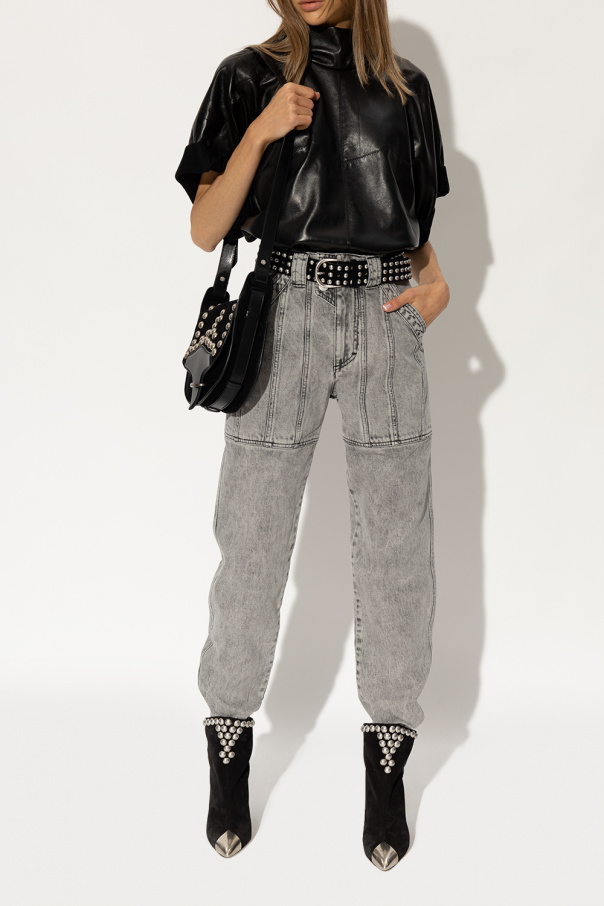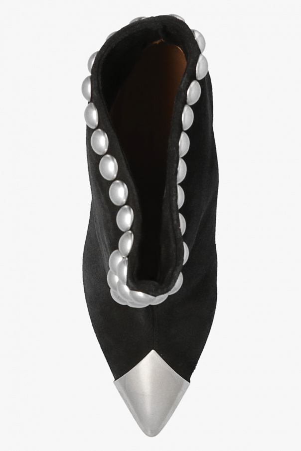 Black ‘Lapio’ heeled ankle boots from Isabel Marant. Crafted from suede with a slip-on style, this model sits on a beige leather sole and features stud embellishments, silver-tone metal elements and a pointed toe with hardware detail.