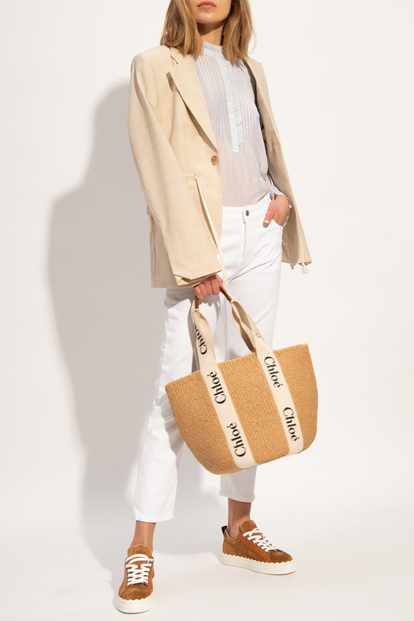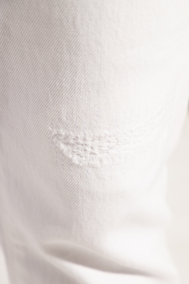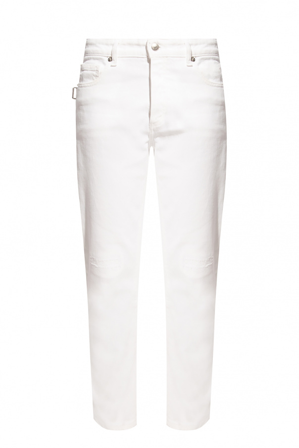 White distressed jeans from Zadig & Voltaire. Fastened with buttons, this tapered leg design features a logo-embossed appliqué in silver-tone on the side, three front pockets and two back pockets.
