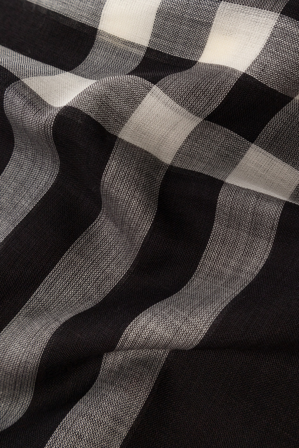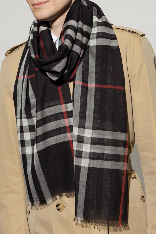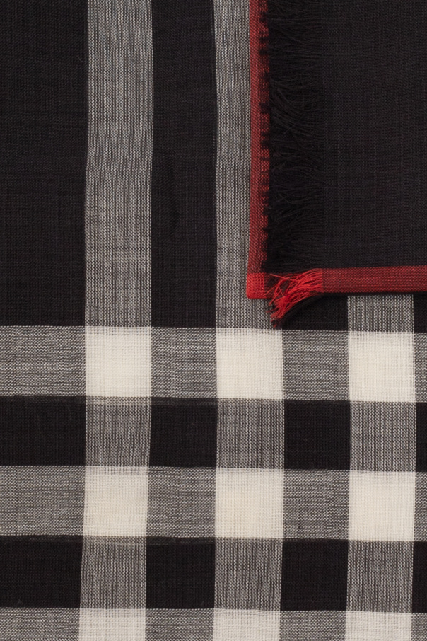 Navy blue scarf from Burberry. Crafted from a wool and silk blend, this item showcases a red and white check pattern and two frayed edges.