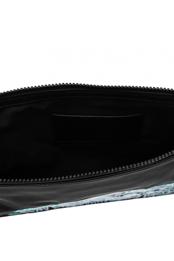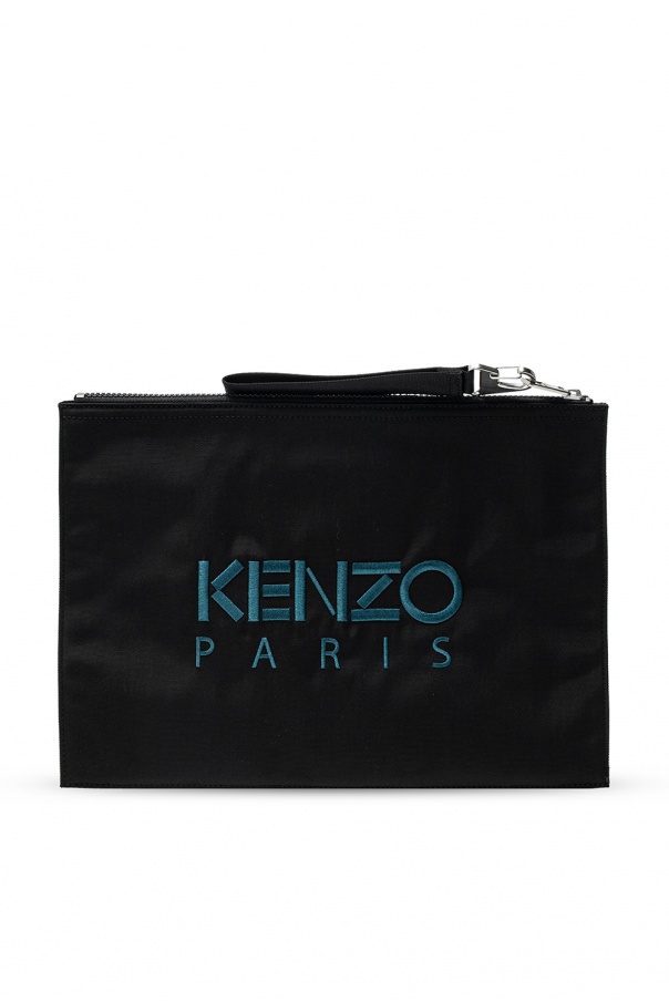 Black clutch from Kenzo. Fastened with a zip, this item features the brand’s signature tiger head motif embroidered in blue, grey and green on the front, a blue logo embroidery at the back, wrist strap with silver-tone snap hook and one internal compartment with one card slot.