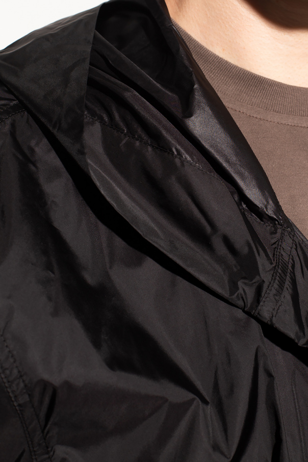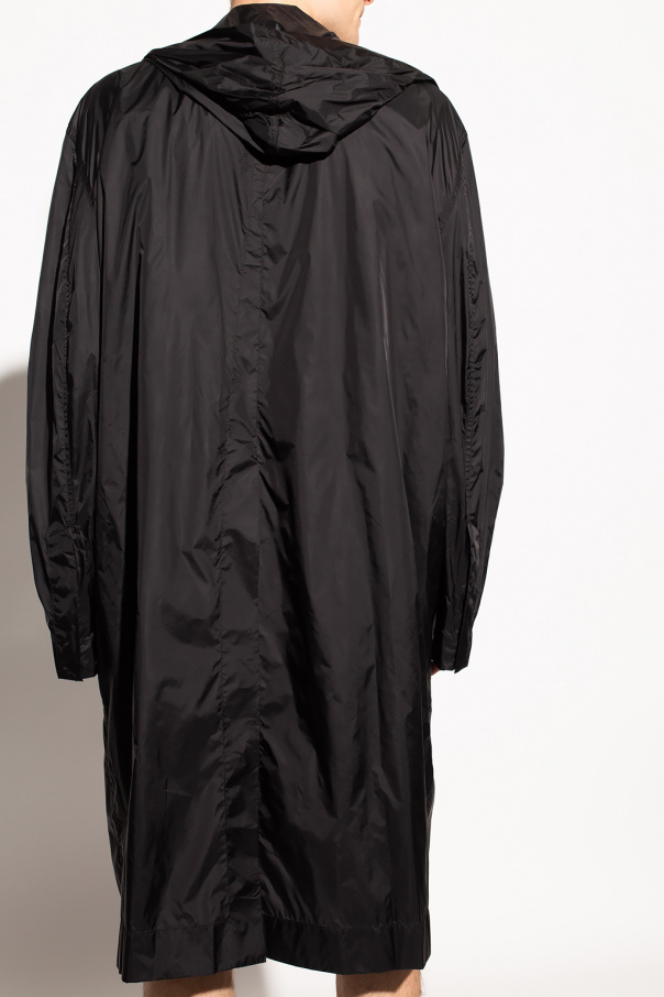 Black hooded coat from Rick Owens. Fastened with snaps, this garment is complete with two slip pockets.