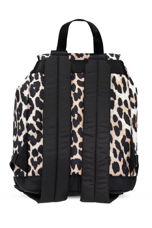 Beige and black backpack from Ganni. Crafted from recycled fabric, this design features a drawstring fastening, fold-over flap with two buckled straps, leopard print, logo patch, two zip pockets, adjustable shoulder straps and one internal compartment with one zip pocket.