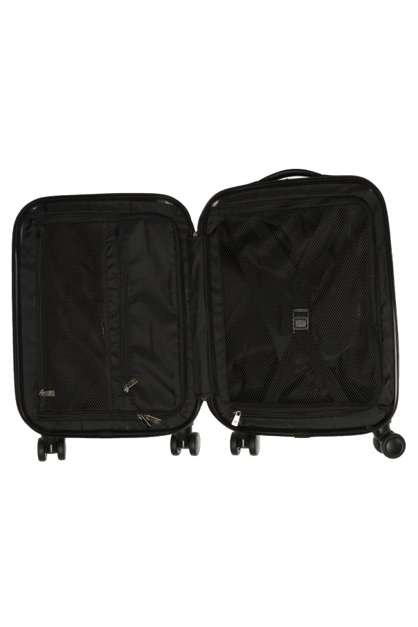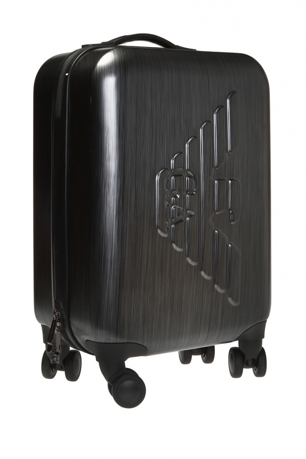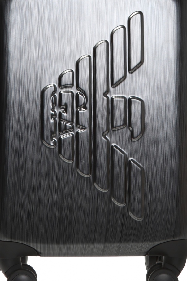 Grey and black suitcase from Emporio Armani. Fastened via combination lock. Embellished with embossed tactile logo. It features a half-round handle, a retractable one as well, 4 rotating wheels and interior with 2 compartments and 2 zipped pockets.