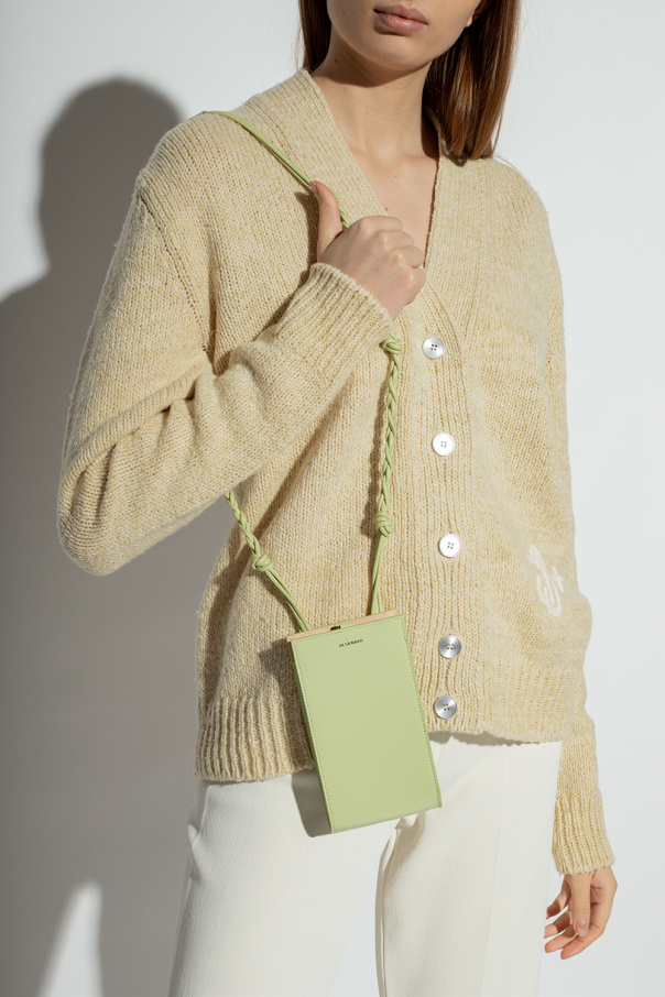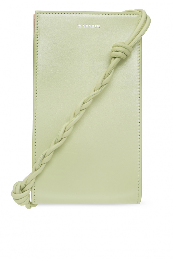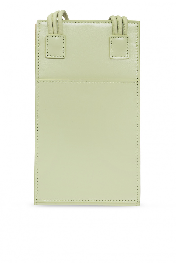 Light green phone holder from Jil Sander. Crafted from calf leather and lamb leather, this design secures with a snap and showcases a silver-tone logo detail, a back slip pocket, a hand-woven shoulder strap, silver-tone metal hardware and a beige-clad interior.