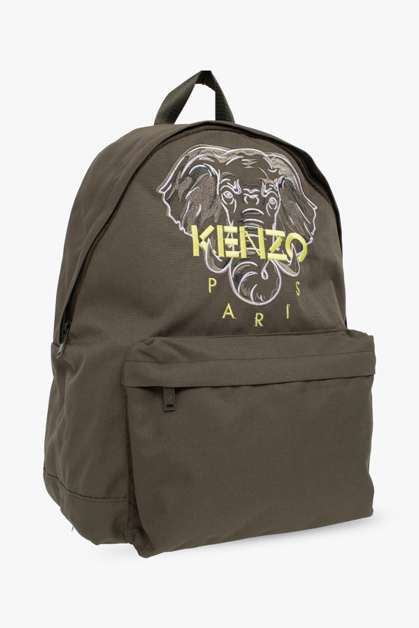 Green backpack from Kenzo Kids. Emblazoned with an animal motif accompanied by a logo, this design secures with a zipper and features a half-round handle, adjustable shoulder straps, green metal hardware and one internal compartment with a zip pocket.