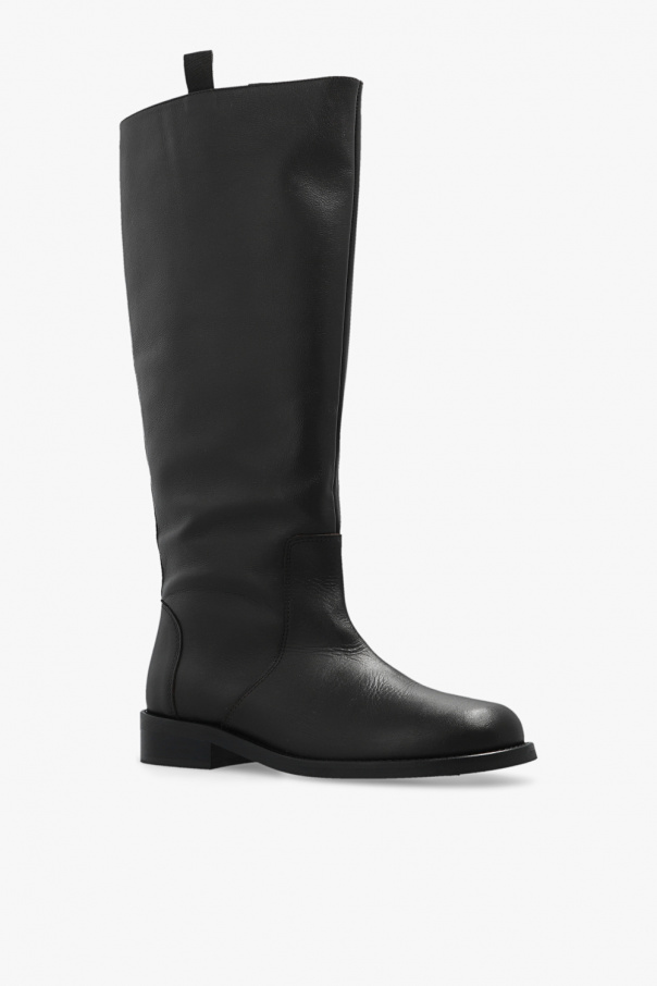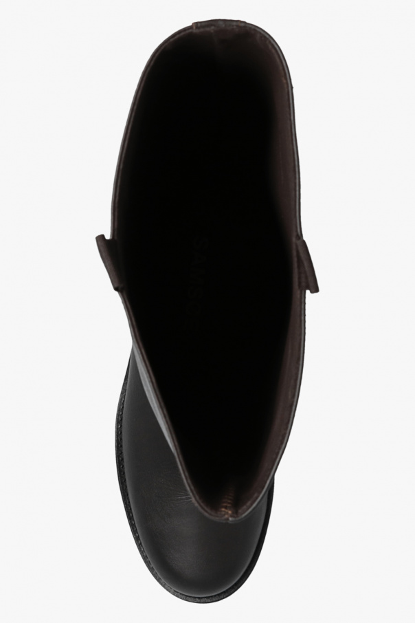 Dark brown ‘Kyla’ slip-on boots from Samsoe Samsoe. Crafted from leather, this design has handles on the sides, round toe and black rubber sole.