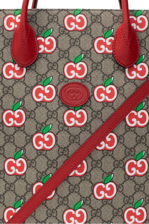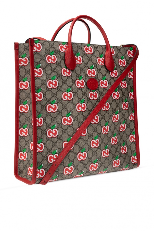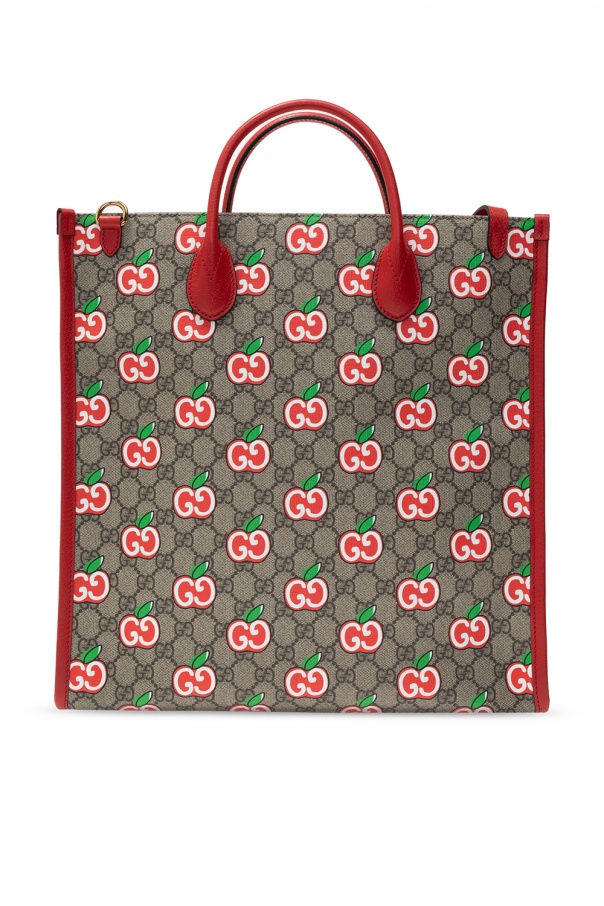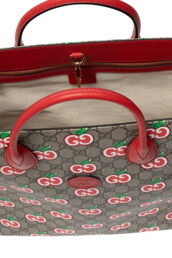 Beige shopper bag from Gucci. Crafted from canvas with red leather trims, this item features a snap hook, printed logo pattern in red, white and green, a brown logo, two half-round handles, detachable adjustable shoulder strap, silver-tone metal hardware and main internal compartment with one zip pocket.