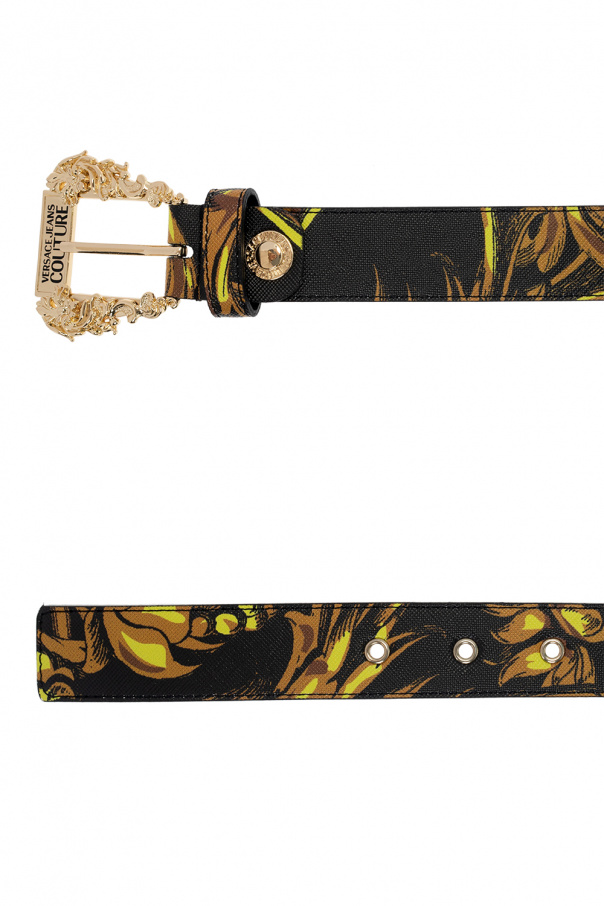Black belt from Versace Jeans Couture. Made of leather, this item features the label’s signature yellow and brown Baroque motif and fastens with a decorative logo buckle in antiqued gold-tone.