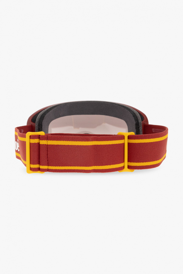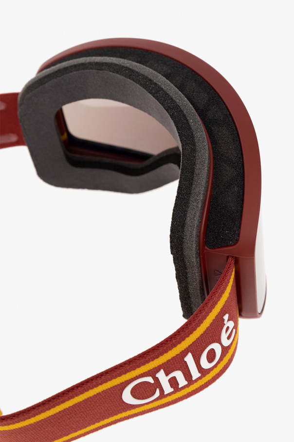 Maroon ‘Cassidy‘ ski goggles from Chloé. This pair has injected matte frames, maroon and yellow elastic strap with a white logo appliqué, purple polycarbonate lenses with Zeiss technology, silver-tone mirror effect and 100% UVA/UVB protection.