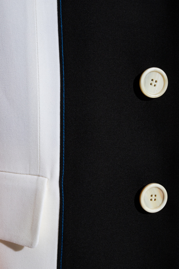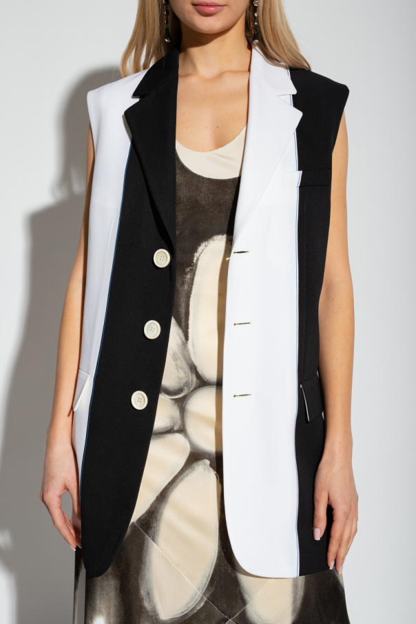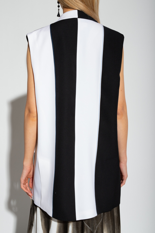 Black and white vest from Marni. Made of wool with an oversize silhouette, this style features a vertical stripe pattern, a collar with notch lapels, one slip pocket, two flapped pockets and a double back vent.