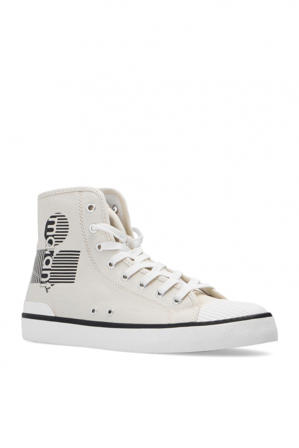 Cream ‘Benkeenh’ high-top sneakers from Isabel Marant. Made of cotton, this lace-up pair sits on a white rubber sole and features a black graphic print with the designer's logo and a white ribbed rubber toe cap.