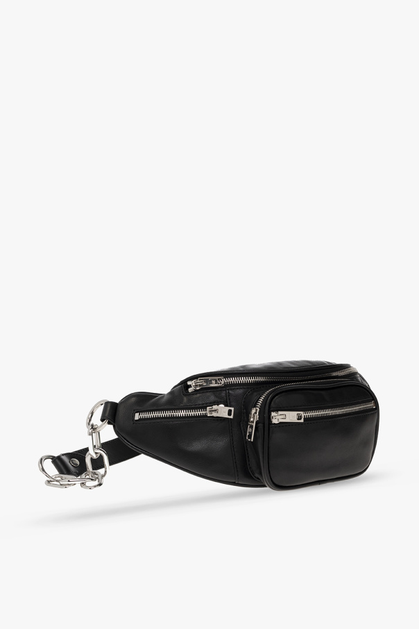 Black ‘Attica’ belt bag from Alexander Wang. Crafted from leather, this item features a zip fastening, silver-tone logo print at the back, adjustable belt with chain inserts, one internal compartment and silver-tone metal hardware.