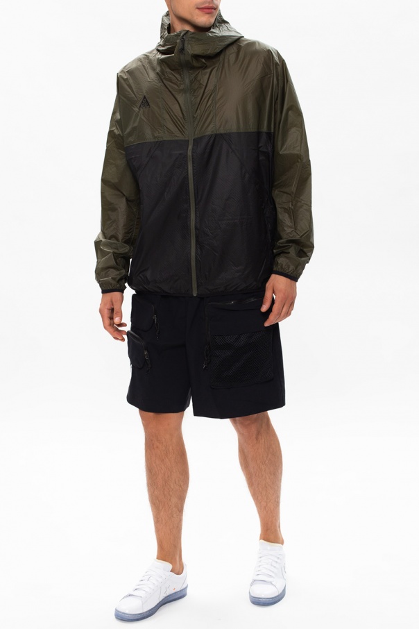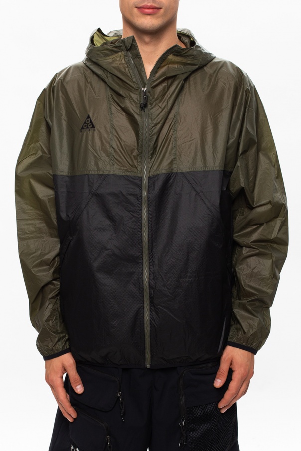 Green and black hooded jacket from Nike, ‘ACG’ collection. Crafted from lightweight fabric with a DWR (durable, water-repellent) finish, this packable item features a zip fastening, printed pattern, embroidered logo, two zip pockets and ribbed trims. This product was designed and tested in Oregon, USA. The state's vast wilderness and climate served as inspiration for the jacket's look and purpose. Nike ACG (All Conditions Gear) apparel is designed to provide convenient solutions for an unpredictable outdoor landscape.