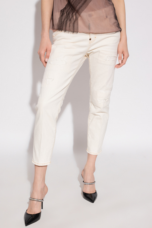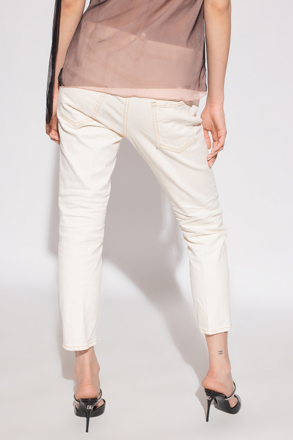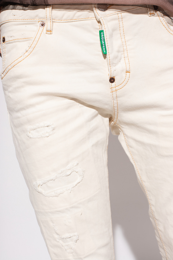 Cream ‘Cool Girl’ jeans distressed jeans from Dsquared2, the ‘One Life One Planet’ capsule collection. Made of organic cotton with the GOTS certificate, this pair falls down with cropped, tapered legs and is complete with dark yellow stitching details, five slip pockets and logo patches.