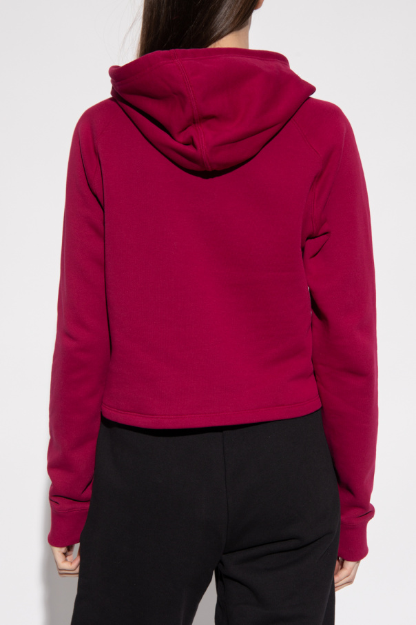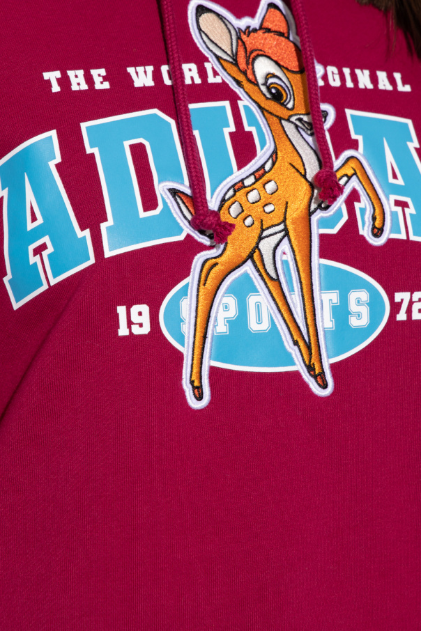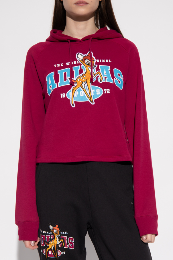 Maroon sweatshirt with a drawcord-adjustable hood from ADIDAS Originals x Disney. Crafted from cotton jersey, this style showcases an embroidered and printed logo in maroon and blue&white, a patch with Disney's Bambi, and long sleeves with elasticated cuffs.