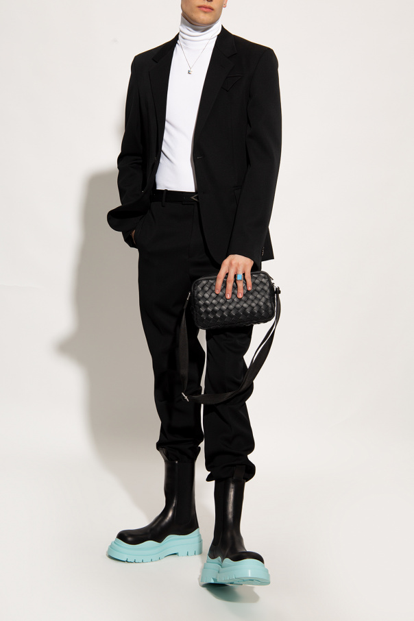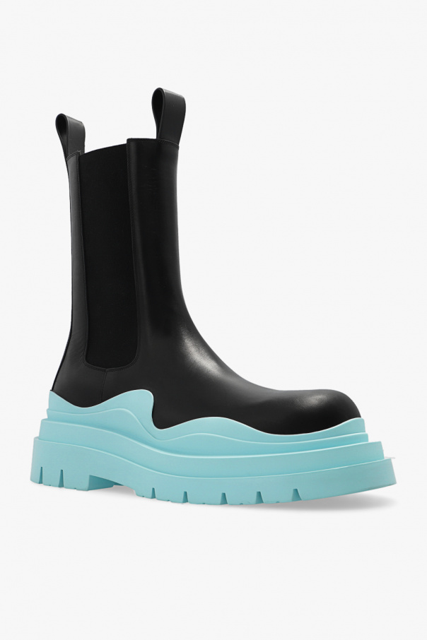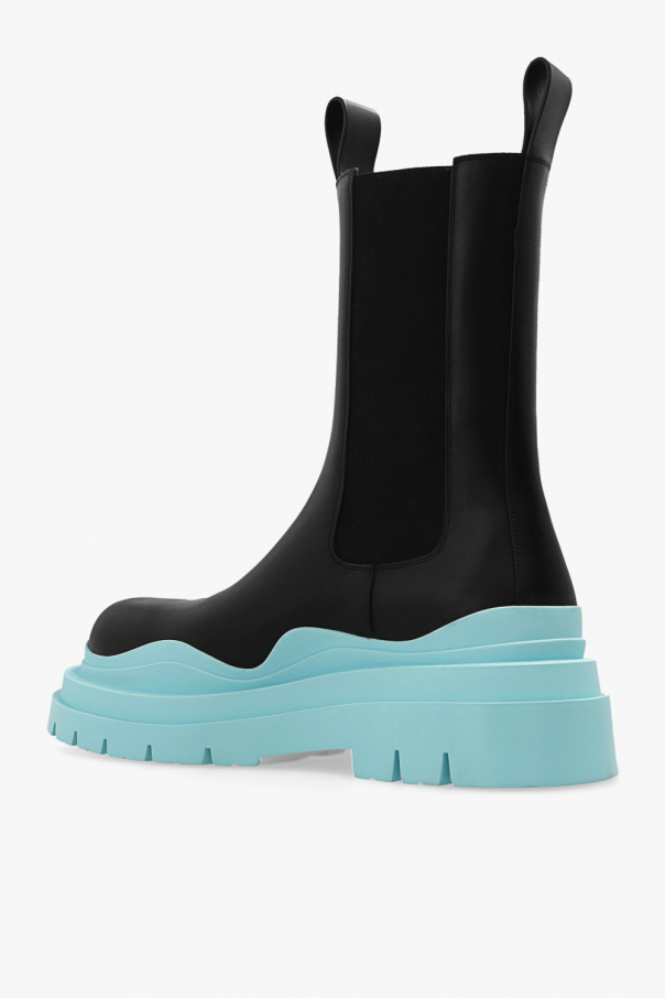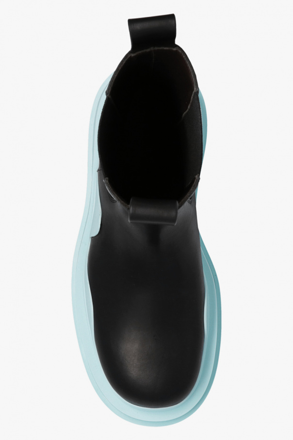 Black ‘Tire’ ankle boots from Bottega Veneta. Made from leather with a slip-on silhouette, this model sits on a blue rubber sole and features elastic panels on the sides.