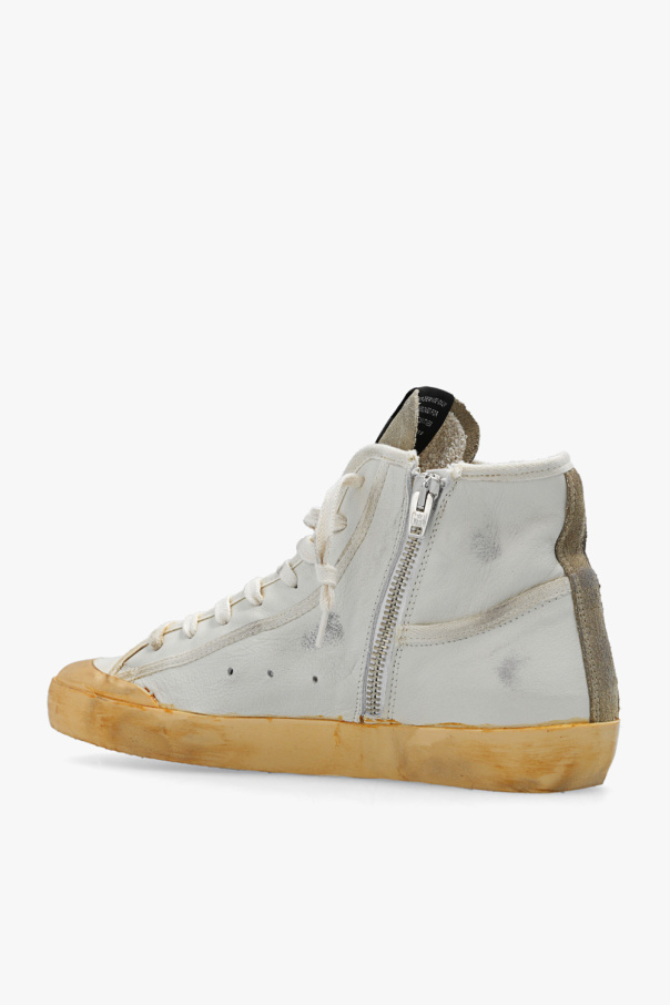 White ‘Francy Penstar’ high-top sneakers from Golden Goose. Crafted from leather, this lace-up pair features a side zip, the brand’s signature glitter star appliqué in maroon, ‘Francy’ patch detail, suede stripe in grey at the back and brown rubber sole.
