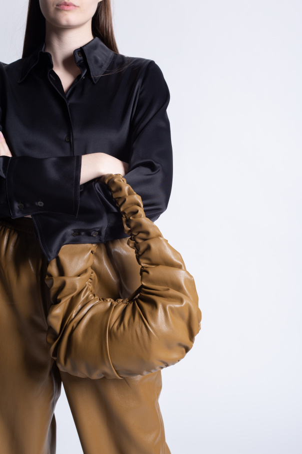 Brown hand bag from Nanushka. Made of vegan leather, this design features a zip fastening, decorative gathers and gold-tone metal hardware.