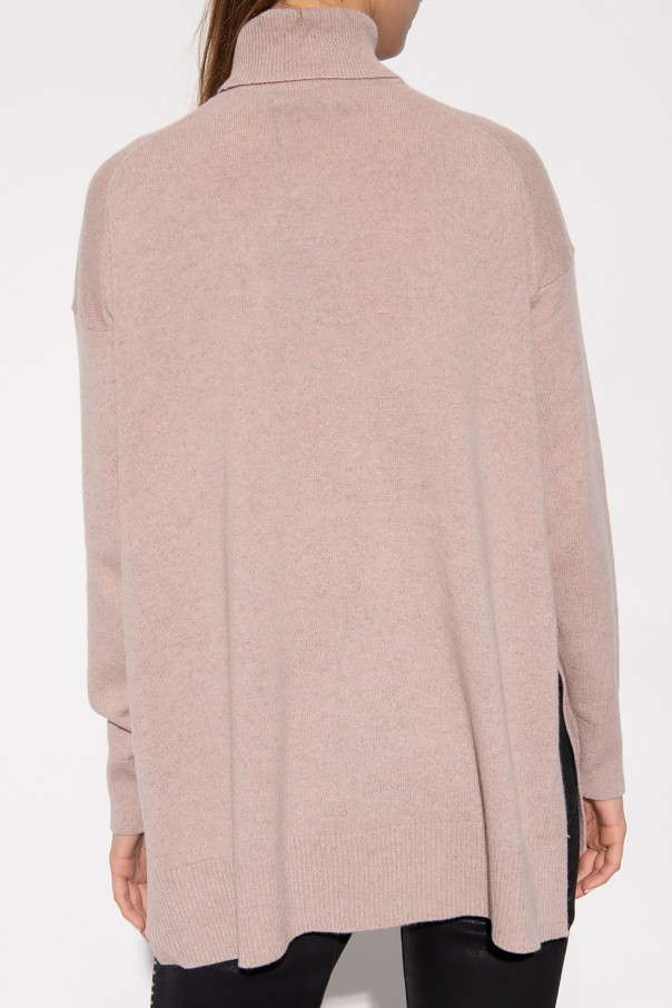 Blush pink ‘Gala’ sweater from AllSaints. Made of cashmere with a relaxed silhouette, this style features a snug roll neck, side bottom splits and ribbed trims on the collar, hem and cuffs.