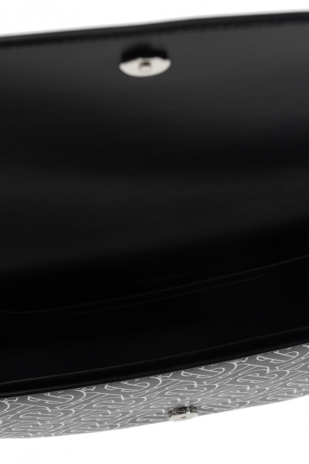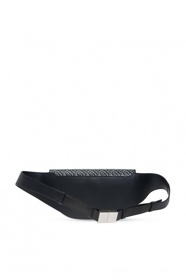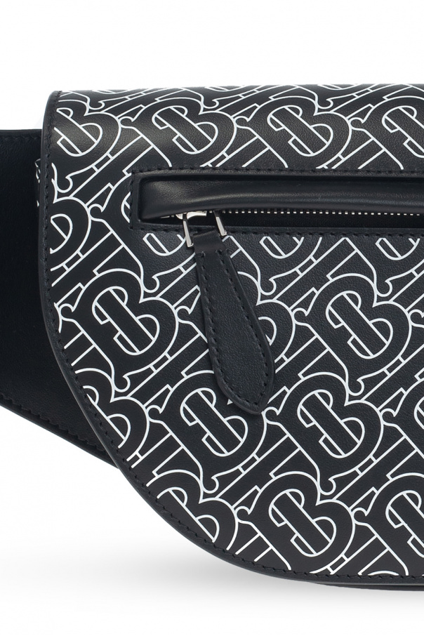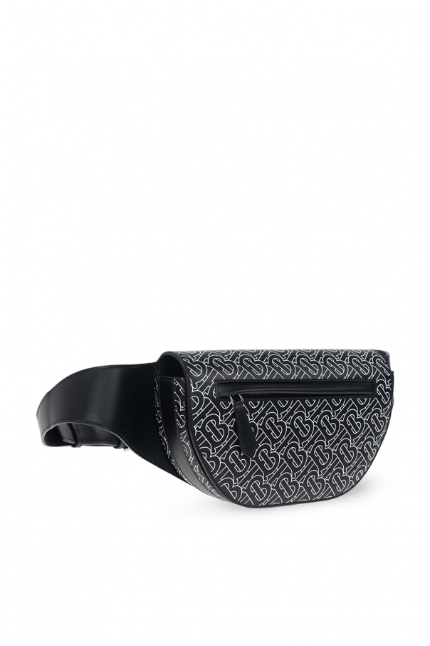 Black ‘Olympia Small’ belt bag from Burberry. Crafted from calf leather, this model features a fold-over top with a magnetic snap, monogram logo in white, front zip pocket, back slip pocket, adjustable shoulder strap, silver-tone metal hardware and one internal compartment with two slip pockets and one card slot.