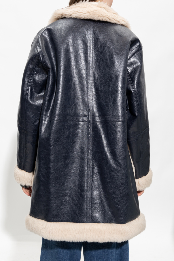 Black ‘Rinna’ coat from Stand Studio. Crafted from faux leather, this style is lined with wool and features a two-way zip fastening, wool trims, a collar with buckle strap, two frontal pockets and long sleeves.