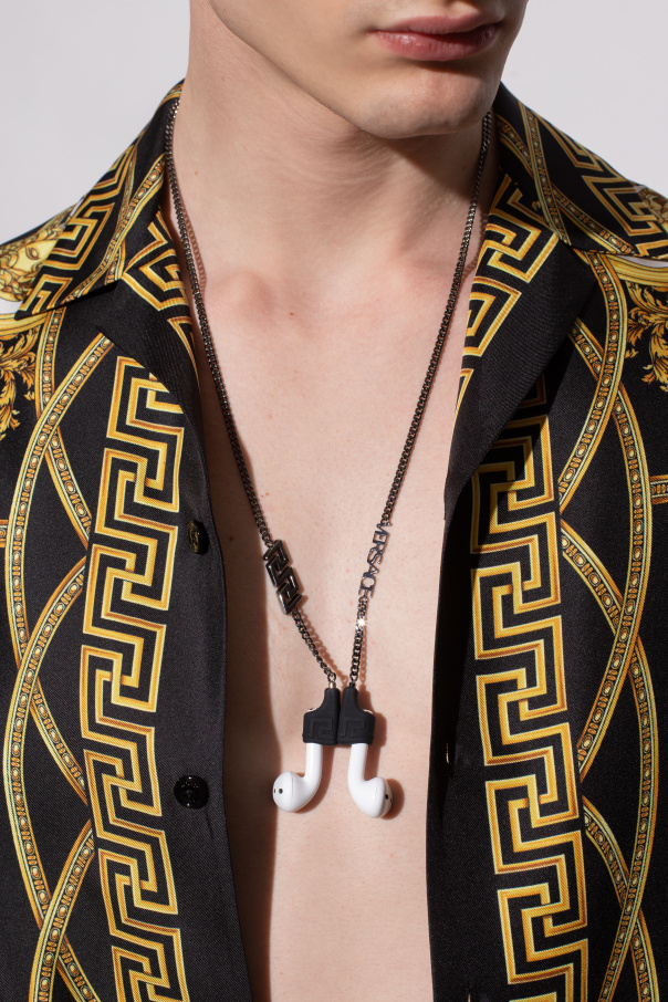 Silver-tone AirPods chain from Versace. It is decorated with a logo detail, the iconic Greek motif and magnetic silicone earphone holders.