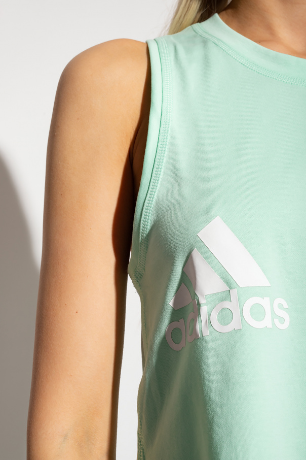 Light green training tank top from ADIDAS by Stella McCartney. Crafted from a blend including organic cotton and recycled polyester, this style features a relaxed silhouette with an elasticated round neck, side bottom slits, exposed stitching and logo prints.