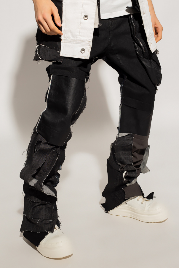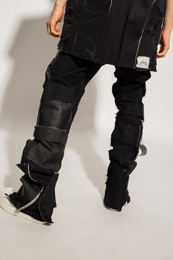 Black jeans from Owens x Swampgod. Crafted from cotton, this pair falls with slightly flared legs and features button fastenings, six slip pockets, one zipped pocket and distinctive stitching and inserts. Item designed to celebrate the 10th anniversary of VITKAC.