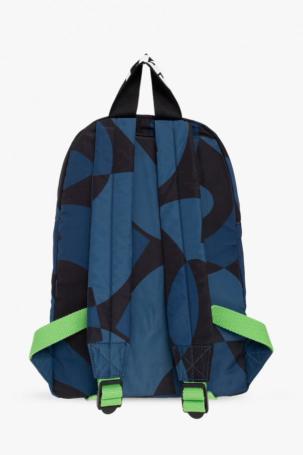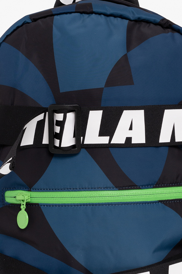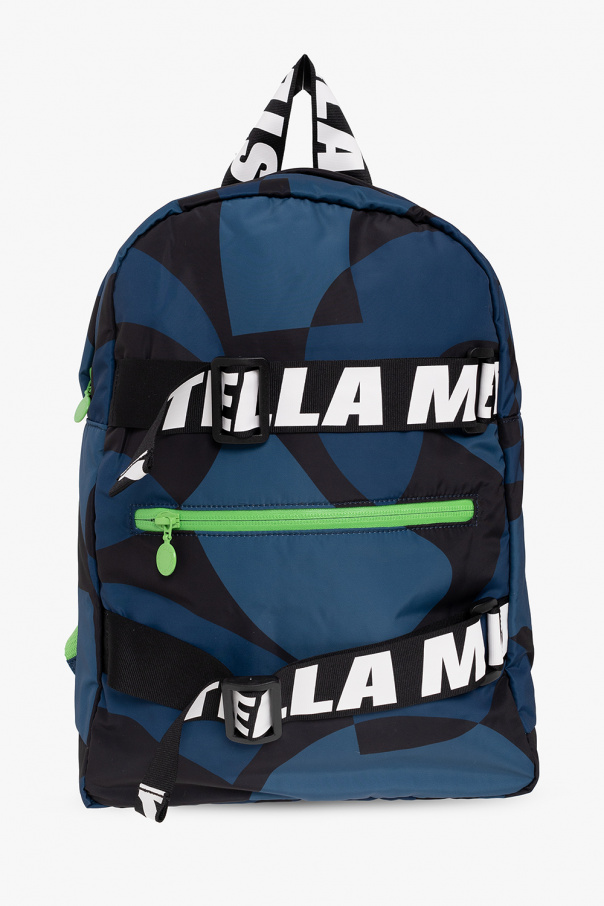 Navy blue and black backpack from Stella McCartney Kids. Crafted from recycled material, this design secures with a two-way zipper and features a zip pocket and adjustable straps with a white logo on the front, a half-round handle, green details, adjustable shoulder straps and one internal compartment.