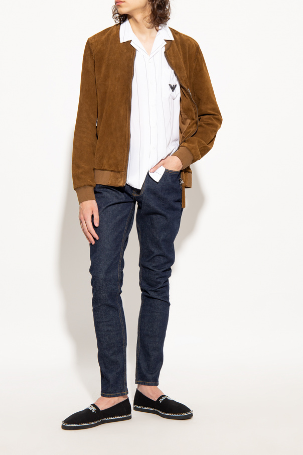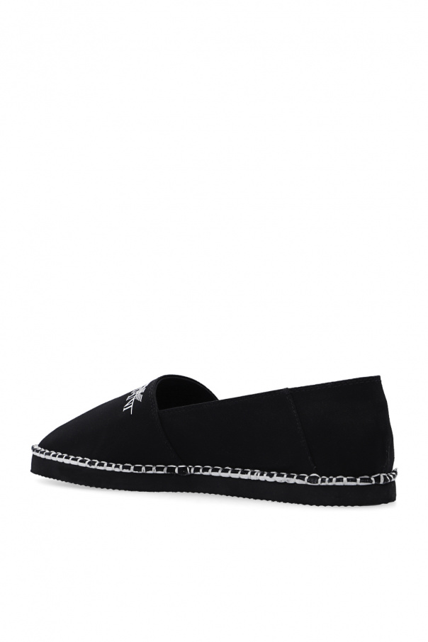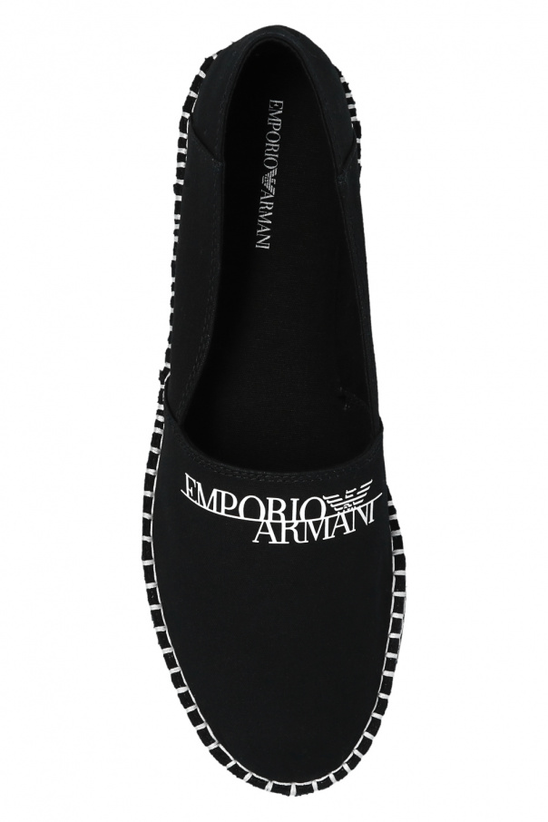 Black espadrilles from Emporio Armani. Crafted from cotton, this pair features a white logo print, stitching detail and black rubber sole.