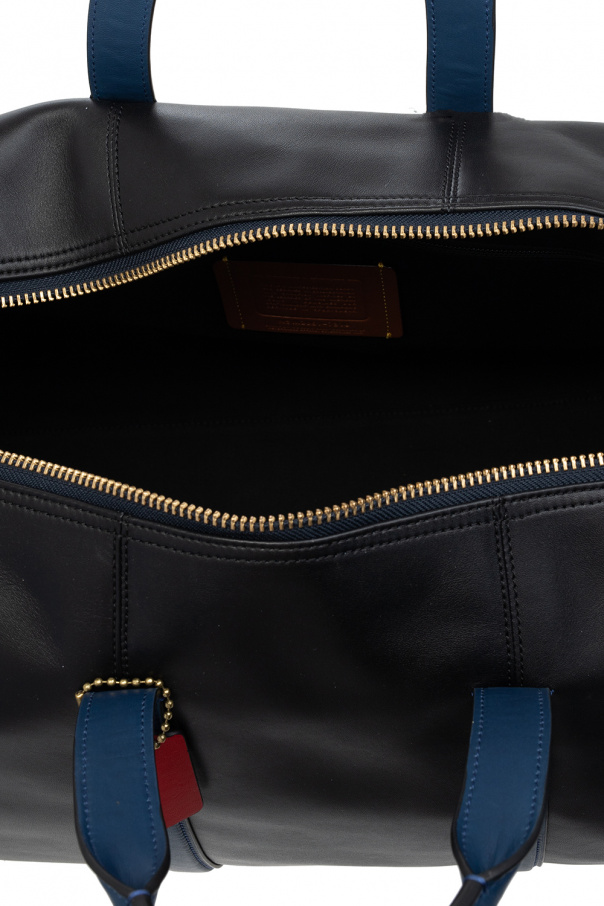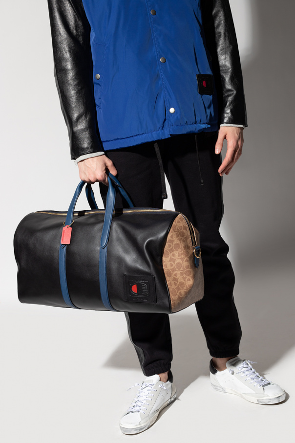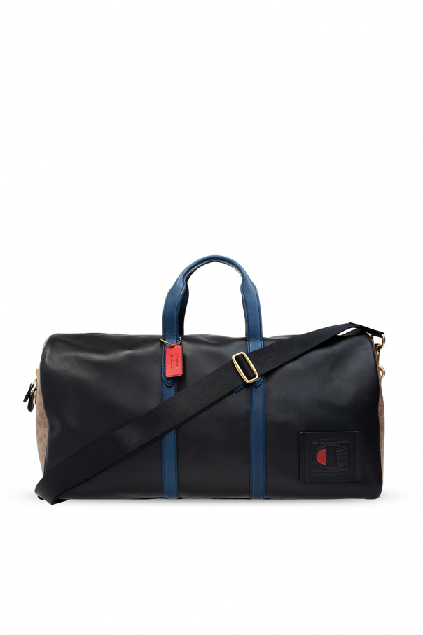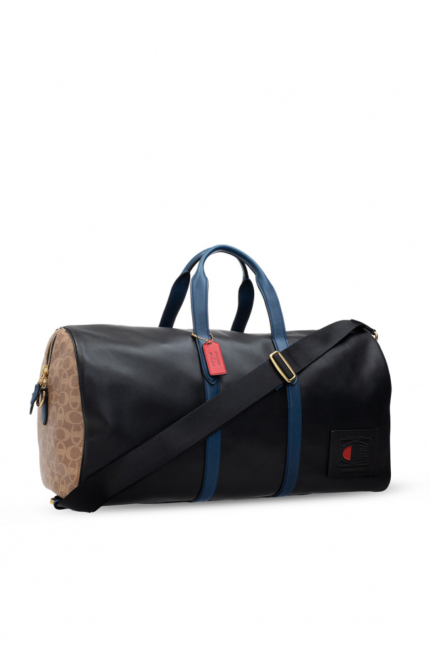 Black duffel bag from Coach x Champion. Finished with the signature canvas, this design fastens via a two-way zip and features a logo patch, two half-round handles in navy blue, an attached logo charm, an adjustable strap and one internal compartment with one zip pocket and two slip pockets.
